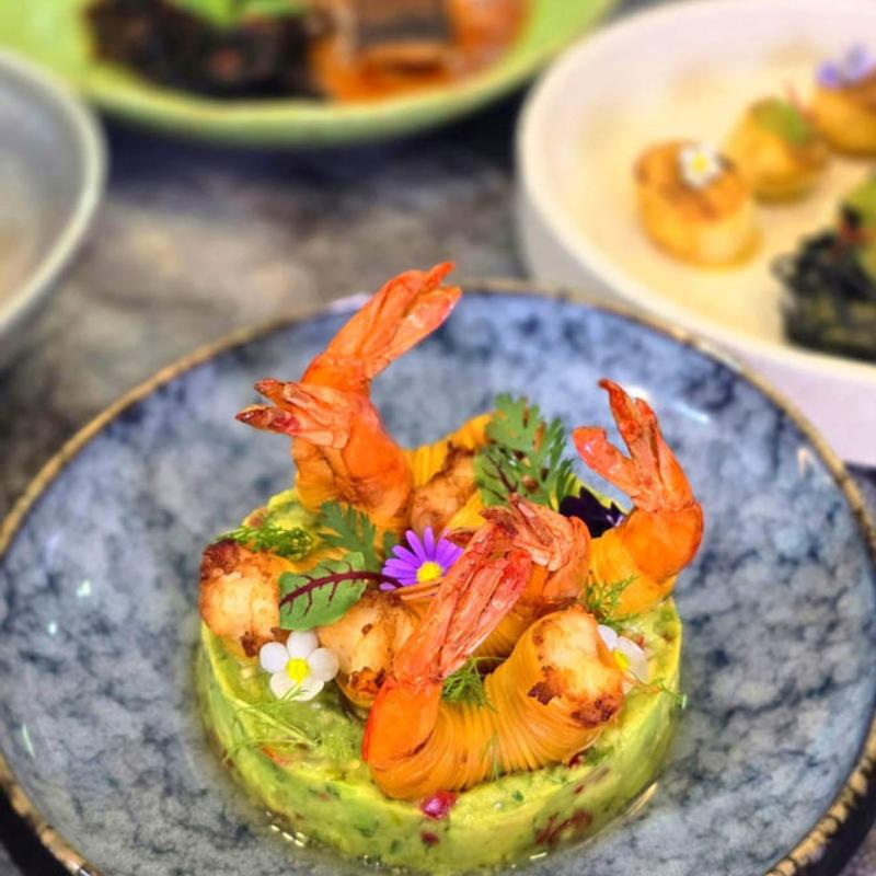 Shrimp delicately wrapped in crisp noodles, served with Thai guacamole.
