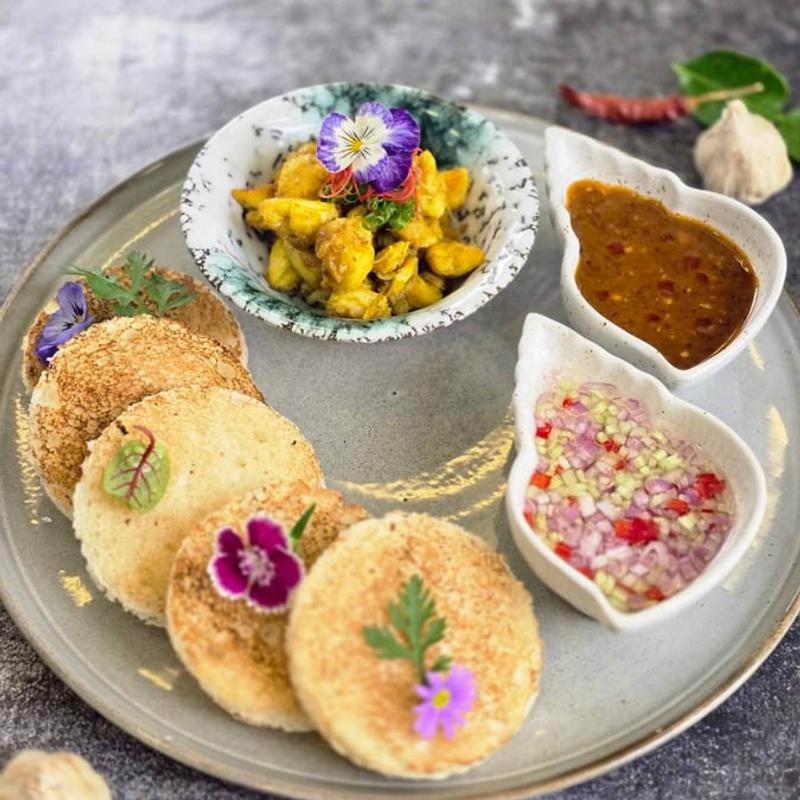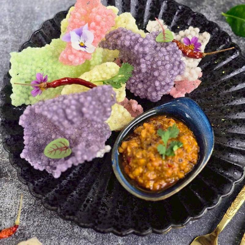 Delicate tapioca pearls filled with minced chicken and roasted peanuts, finished with tamarind reduction, chili paste, and coconut cream, served with traditional peanut sauce.
