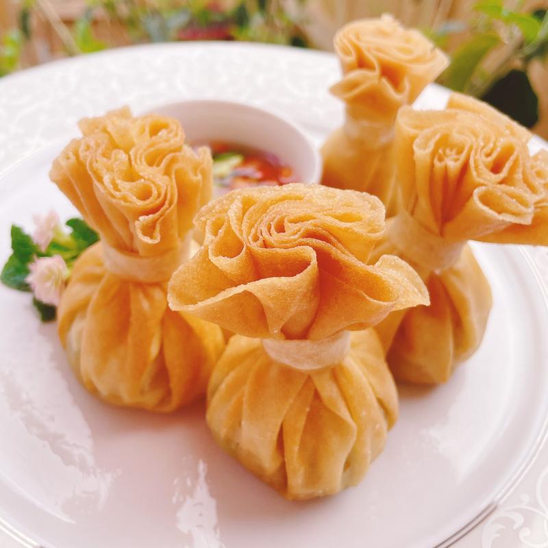 Crisp golden pouches filled with shrimp, chicken, peas, carrots, corn, and onions, served with refreshing cucumber relish.